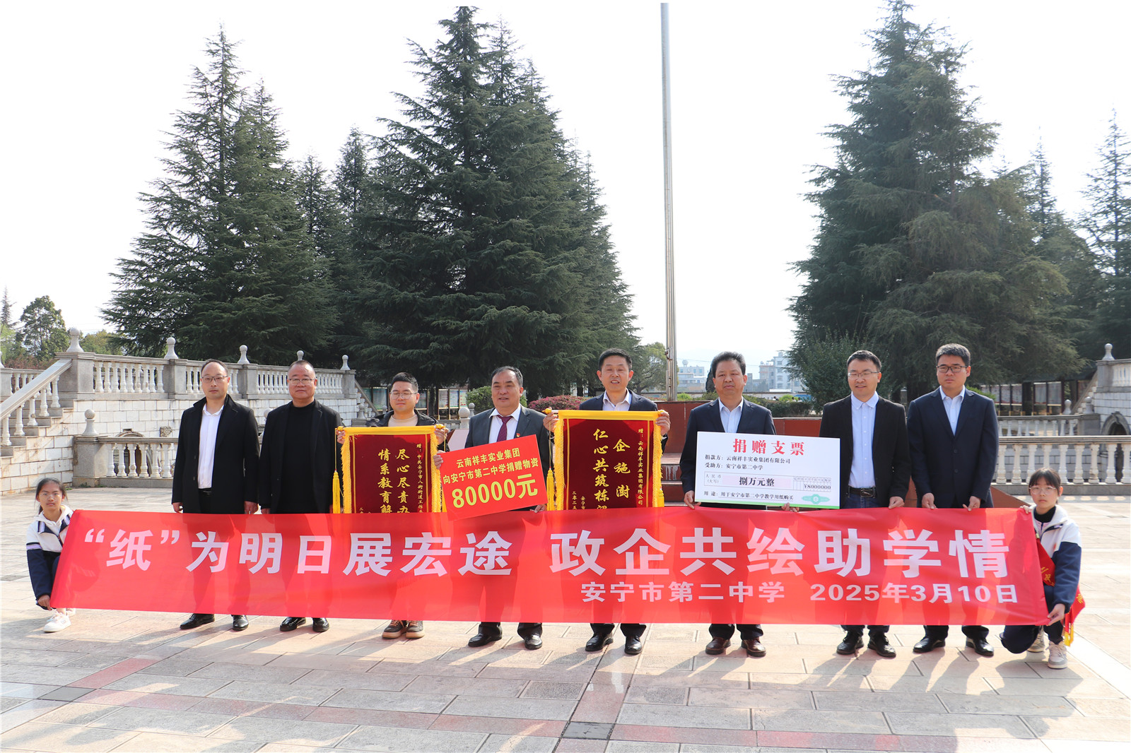 2025年3月10日上午,云南祥豐集團(tuán)愛心捐贈(zèng)儀式在安寧市第二中學(xué)升旗廣場(chǎng)隆重舉行。祥豐集團(tuán)向該校捐贈(zèng)總價(jià)值8萬元的教學(xué)物資,用于改善學(xué)校教學(xué)條件,助力教育事業(yè)發(fā)展。云南祥豐集團(tuán)黨委書記魯留定、工會(huì)主席劉國(guó)昌,安寧市第二中學(xué)校長(zhǎng)吉學(xué)貴等領(lǐng)導(dǎo)及全校師生代表共同見證這一暖心時(shí)刻。